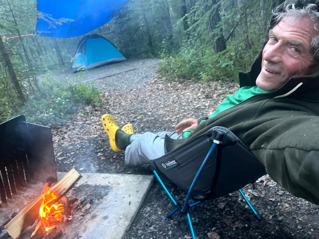 I woke up in my tent at first light around 5 AM. The morning was noticeably cooler and clouds were threatening. I decided to walk into the village to try and book a flight to see Denali from the air. I learned the best way to do that was to fly out of TALKEETNA, a small town about 150 miles south. I called all three air services for a flight tomorrow, but they all said chances were slim. The other option was camping in the rain.
