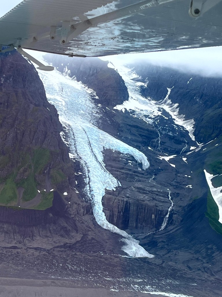 We lifted off, gliding through glacial moraines etched into the rugged mountains — pure magic. The plan was to land on a glacier near DENALI, but just before arrival, the headset crackled: weather shut us down and DENALI, socked in the clouds. Still, an unforgettable ride… and with a credit, my cost was just $200. Bargain.