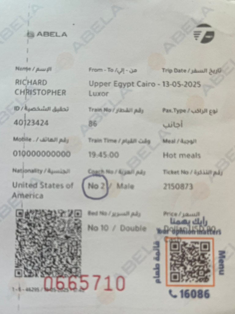 I arrived at Giza station with time to spare. It was far rougher than Ramses Station, but offered a glimpse of local life. My 7:45 train showed up after 9:00. I boarded, found my cabin—and lucked out: no roommate.