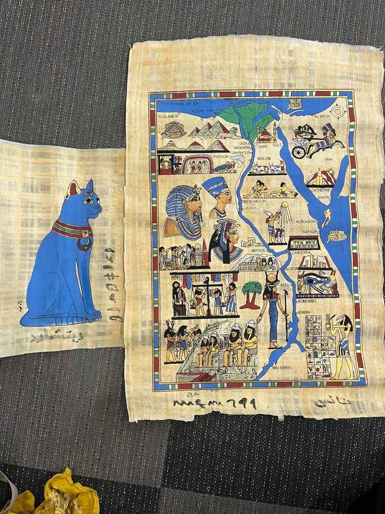 Still, I really liked one of the pieces—it was a map of Egypt highlighting the places I planned to visit. He handed it to his sister, who painted my name on it. Naturally, that had to dry too.