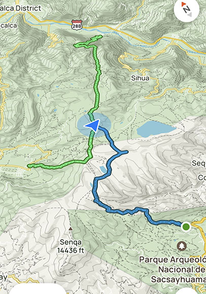 Elias took us off to the right to another summit where we stopped to have lunch. Noticing that cell service was restored my AllTrails app told me that we had hiked about 5 1/2 miles. according to our plan, we should be well over halfway. I communicated this to Elias, and he said no. I looked closely at the app and had some serious questions about our direction. I looked Elias in the eye and said “Are we lost? “What is Lost?” He spoke. I typed “lost” in my Google app and it displayed “Perfdido”. Elias looked at me glumly. He explained that he’d only done this hike 6 years ago. I asked how many times, and he said, “Once”. Then he said, “but very cloudy”, he said, waving his hands in the air. “I think that way,” he pointed. My app told a different story. We would have to go about 90° to the right of where he was pointing. I convinced him to follow my direction and off we went. You can see by the screenshot of the map below, we were going off course to the right. I got us back to the trail which Elias would have taken us back to Cusco!