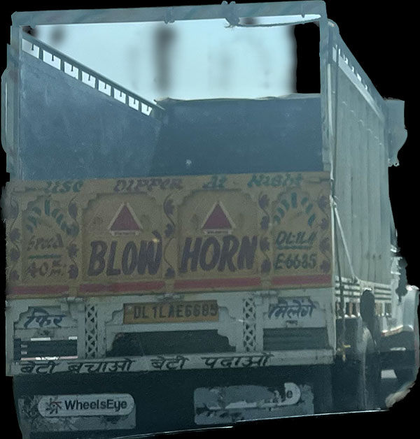 India’s primary safety measure on the road seemed to be honking the horn, often leaning on it. This was completely expected. In America, honking your horn might lead to rude gestures, but in India, it was an altruistic gesture, with many vehicles displaying signs that read “HONK HORN” or “PLEASE HONK” on the back to alert others.